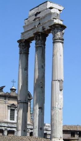 this arches are all that survives of the temple of the twin gods, castor and pollux, who were believed to have helped the romans win an early military victory against neighboring peoples.