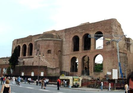 this photo shows the apse (or rounded end) of the huge temple to the goddesses venus and rome. in the middle ages, part of the temple was used for a church to the virgin mary, rebuilt and rededicated to saint frances of rome (santa francesca romana) in the 17th century. the 12th-century campanile still stands.