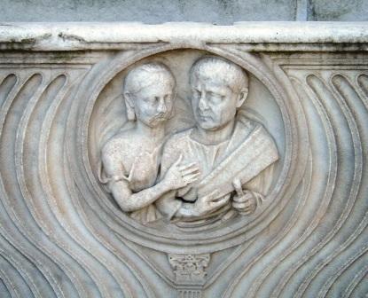 on the side of a roman sarcophagus, a husband and wife.