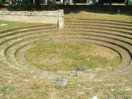 From roman-era paestum, the depression of the amphitheater remains.