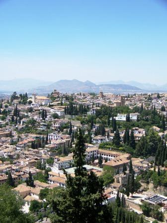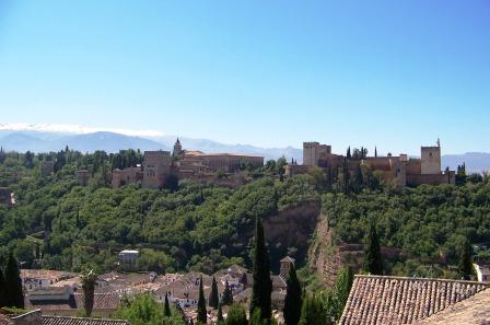 Granada, first settled by Greeks who set up a trading depot with the local Iberian tribes in the fifth century B.C.E., was the last capital of Moorish Spain, from 1238 to 1492 C.E. It thrived on trade in silk and pomegranates, both locally produced. It is set at the edge of the Sierra Nevada mountains, and so is much cooler in the summer than other parts of southern Spain. (In fact, it had rained heavily during the week before we arrived, so the mountains were snow capped when we arrived, as you can see from the photo below. By the end of our week there, all of the snow had melted.)