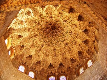 One of the most beautiful and most famous parts of the Alhambra is the Courtyard of the Lions. In the middle of each side of the courtyard is a small pavillion thought to represent the four corners of the earth and the four rivers flowing into the Garden of Eden. Notice the small channels of water that run out of each along the floor toward the fountain in the center. The implication is that the Alhambra is an earthly paradise. (Unfortunately, the lions holding up the fountain at the center of the courtyard had been removed for restoration when we visited.)