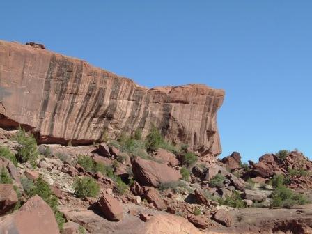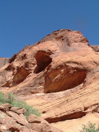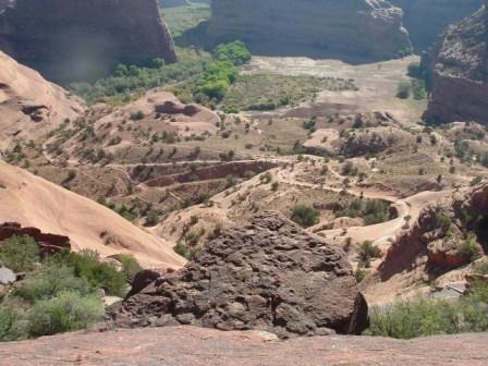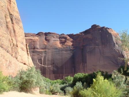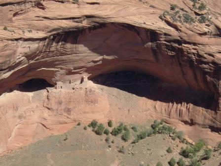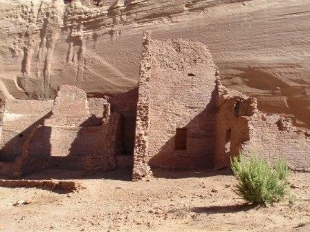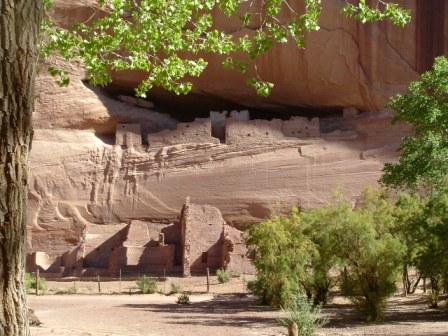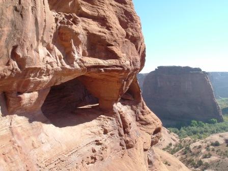 This last image is of Spider Woman rock, where Navajo legends say that the Spider Women lives. She is believed to havetaught the Navajo weaving, for which they are still renowed, but now she is also said to steal at eat bad Navajo children. There are lots of ancient Anasazi ruins along the cliff walls of Canyon de Chelly, as this next photos shows.