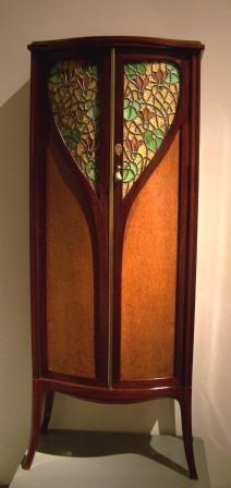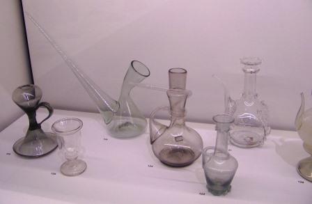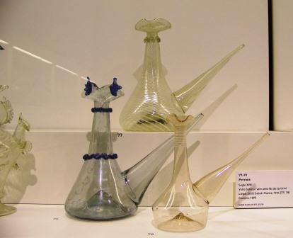 of inlayed wood with multiple compartments. Below: glass bottles of unusual