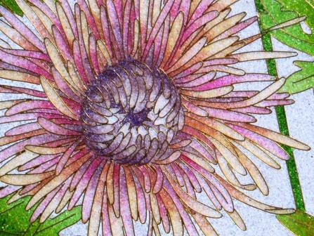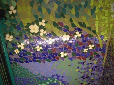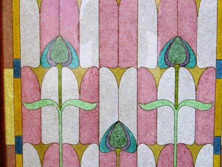 There is a wide range of art inside. One example: these decorate panels made of thousands of tiny colored glass beads.