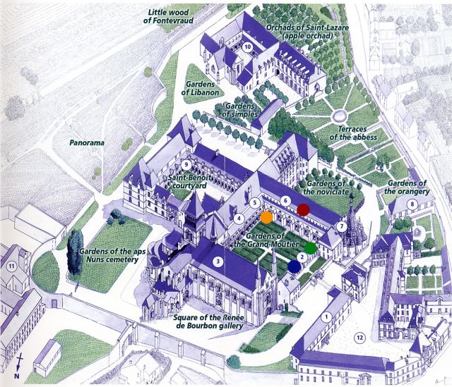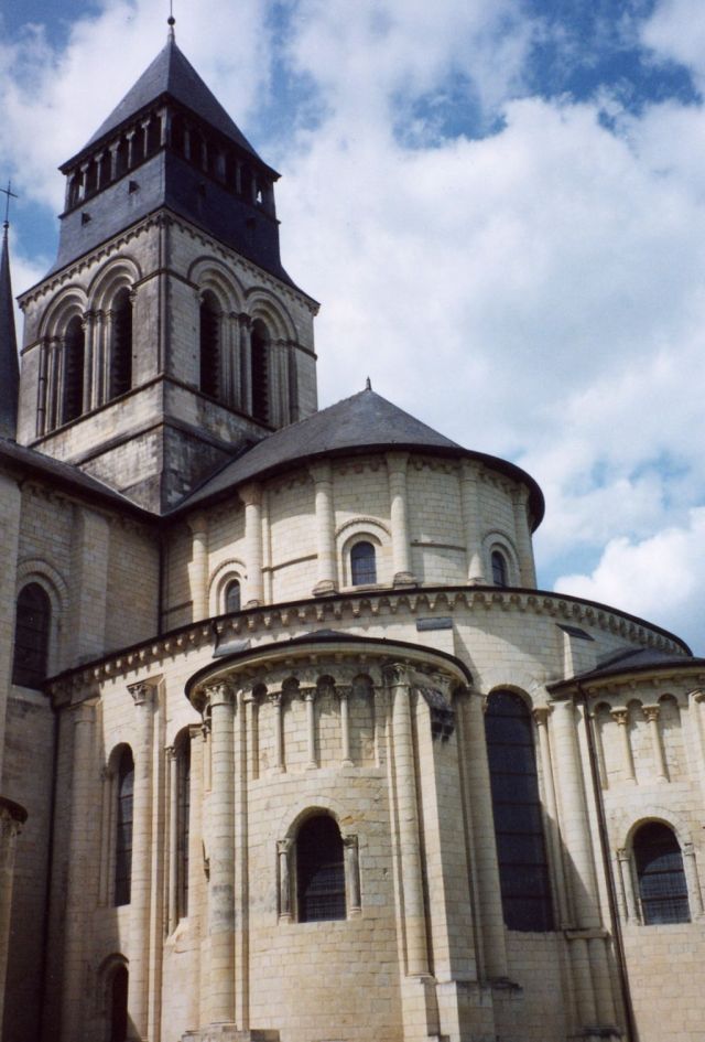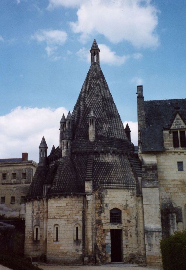 From there we drove to Fontevraud. It is a famous medieval monastery, built in the 12th century. It at first housed both monks and nuns -- one of the few monasteries of its day to have co-ed monasticism! -- but later became a convent solely for nuns. It was patronized by Henry II of England, and he and his queen, Eleanor of Aquitaine, are buried in the monastery chapel, as well as their son, Richard I the Lion Hearted, and Isabela of Angouleme, who was queen to his brother John. Many of the monastery buildings have been altered over the years -- it served as a prison from 1804 to 1963! -- but some of its medieval past survives.