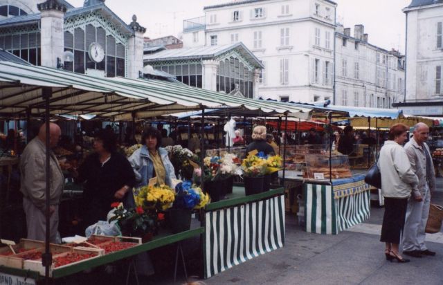 That night we stayed at La Rochelle along the coast. La Rochelle was a big commercial port during the Middle Ages. In the 16th century, though, the population was mostly converted to Protestantism, and sought for a century and a half to obtain rights of religious freedom. But in the 1680s, King Louis XIV decided to eradicate Protestantism from France, and his minister of state, Cardinal Richelieu, beseiged the town when it refused to surrender. The town was taken, the Protestants were expelled from France (many of whom went to Holland, and from there to South Africa), and the port fell into decline. These days it is very touristy, but still a nice coastal city, and our hotel was right on the old port, overlooking the two old towers. When we walked around the town the next day, we happened upon a large farmers' market, where all kinds of fish and produce were for sale.