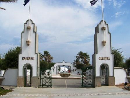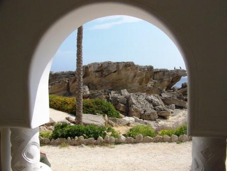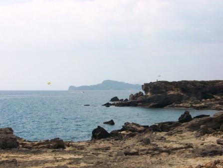 Turning inland, you can see the white buildings of the town itself and the barren hills beyond.