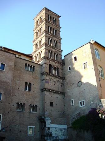 here is the campanile or bell tower of the church of saints john and paul (san giovanni e paolo). it dates from the 12th century, when the church was rebuilt after being sacked by the normans of sicily. the foundations of the campanile are built atop the ruins of the pagan temple to the emperor claudius, deified after his death.
