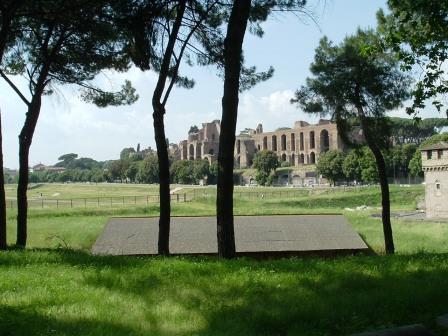between the aventine and caelian hills is a deep valley where the circus maximus was built. its origins may go back as far as the 7th century B.C., but it was julius caesar who enlarged it to over 1000 feet. here were held chariot races until 549 A.D., when the circus was abandoned. nowadays only the open area remains, with grassy banks covering what is left of the seating areas.