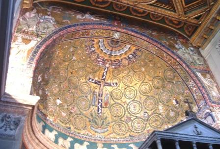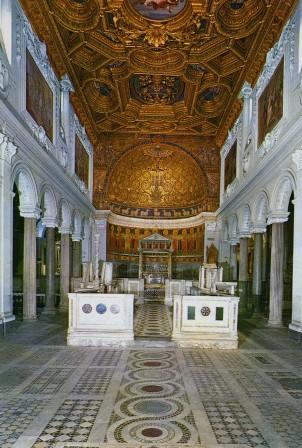 traveling south from the apartment brought us quickly to the caelian hill, known especially for its early christian churches. our favorite was the church of saint clement or san clemente (he was said to have been the second pope of rome, after saint peter). the church was built in 1108, after a fire had destroyed an earlier church on the site. although there has been a lot of renovation of the church over the centuries, its spectacular 12th-century mosaics still dominate the apse (area around the altar).