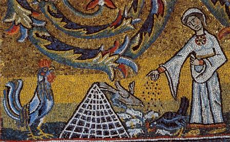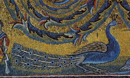 details from the mosaic shows the quality of the work, including images from nature, such as a stag and a peacock, and scenes from everyday life, such as a woman feeding chickens and a man and boy tending sheep (is the boy milking the sheep?).