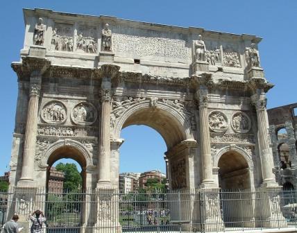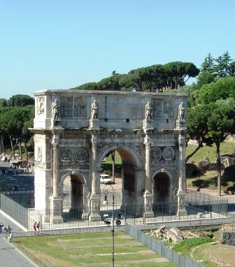 in other cases, structures survive remarkably intact. this is the triumphal arch of constantine, the 4th-century roman emperor who converted to christianity. it reflects the declining fortunes of the empire, since sculptures were reused from older buildings for the arch, to save money and benefit from skills lacking in the later empire.
