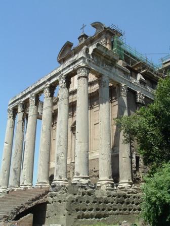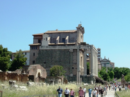 another recycled temple: built in 141 a.d. by the emperor antoninus pius to honor his empress faustina, whom he proclaimed a goddess, it was dedicated also to the emperor himself when he died in 161. in the middle ages, it was converted into a church to saint lawrence (san lorenzo). the present-day church dates from the 17th century.