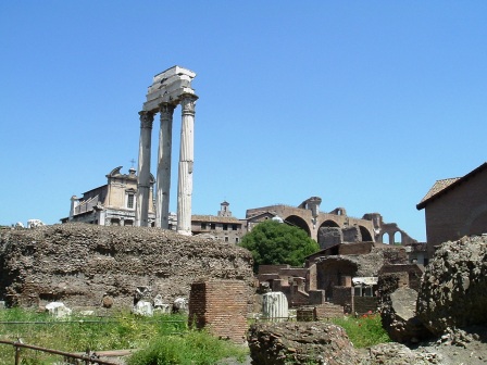 this arches are all that survives of the temple of the twin gods, castor and pollux, who were believed to have helped the romans win an early military victory against neighboring peoples.