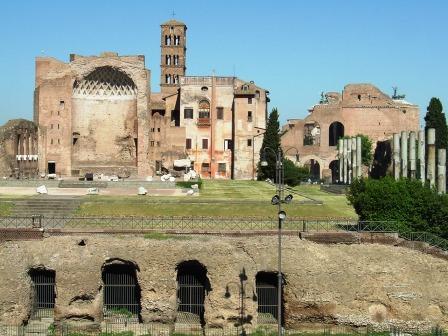 this photo shows the apse (or rounded end) of the huge temple to the goddesses venus and rome. in the middle ages, part of the temple was used for a church to the virgin mary, rebuilt and rededicated to saint frances of rome (santa francesca romana) in the 17th century. the 12th-century campanile still stands.