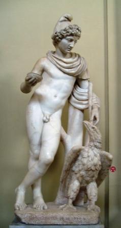 sculptures of the persian god mithra, on the left, the greek mortal, ganymede,