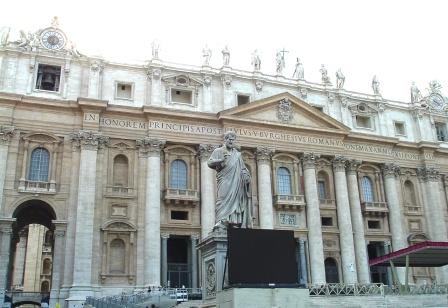 In front of the main entrance to the basilica are large statues of st. peter
