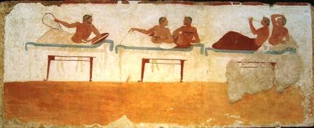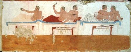 show a banquet, with musicians and a large vase filled with wine (in one, the