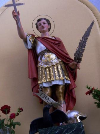 Expeditus is always shown dressed as a Roman soldier, holding a cross in one hand and the palm branch of martyrdom in the other, and stepping on a crow. His legend says that the devil appeared to him in the form of a crow and tried to tempt him to postpone his conversion to Christianity. The Latin word "cras" (seen on his statue coming from the bird's mouth), sounds like a crow cawing and means "tomorrow"--as if the devil were telling him to do it "tomorrow."