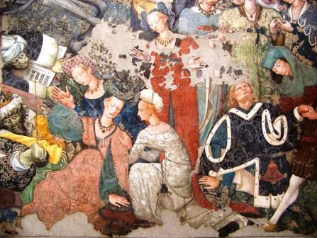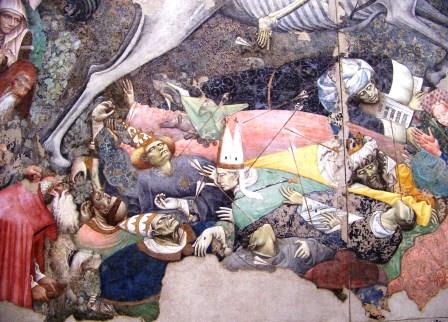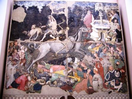 This fresco represents the arrival of the Black Death or Bubonic Plague as an armed skeleton on horseback, shooting arrows at his victims.