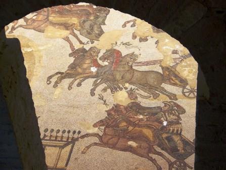 In another room, chariots racing around a long racetrack that seems to a replica of the Circus Maximus in Rome.