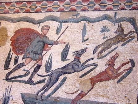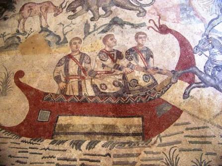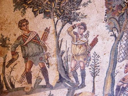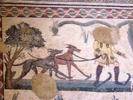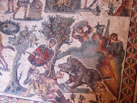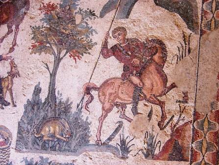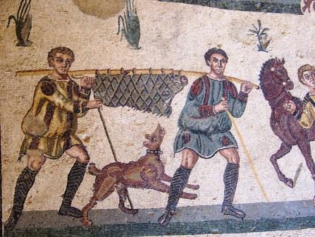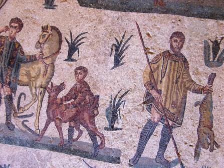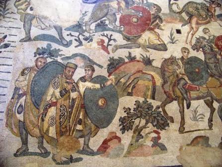 At the center of this mosaic is a richly dressed fellow surrounded by bodyguards, who is probably the emperor Maximian, watching the hunt.