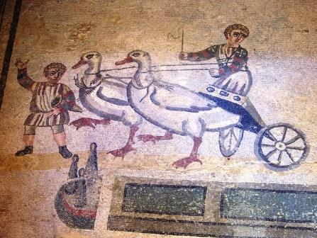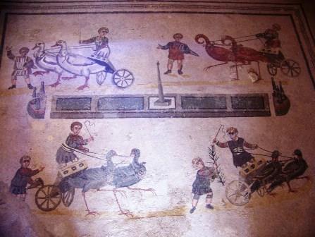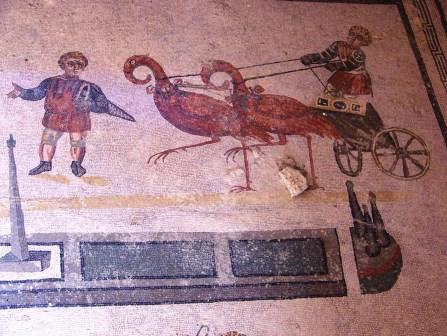Another room has chariot races with children pulled by birds.
