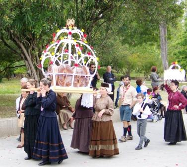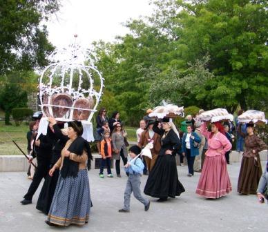 The procession included many families in traditional dress carrying bread loaves on their heads or in wheeled carts or litters.