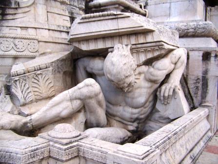 The 1934 monument shows men and women hard at work, despite the giants pushing