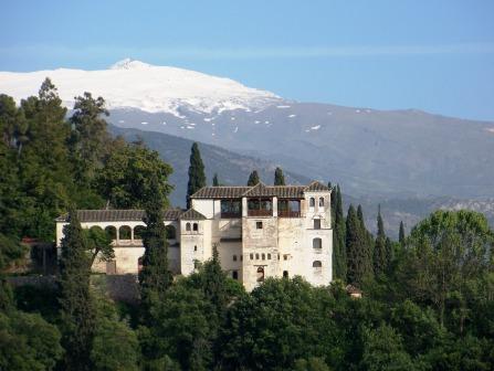 Granada, first settled by Greeks who set up a trading depot with the local Iberian tribes in the fifth century B.C.E., was the last capital of Moorish Spain, from 1238 to 1492 C.E. It thrived on trade in silk and pomegranates, both locally produced. It is set at the edge of the Sierra Nevada mountains, and so is much cooler in the summer than other parts of southern Spain. (In fact, it had rained heavily during the week before we arrived, so the mountains were snow capped when we arrived, as you can see from the photo below. By the end of our week there, all of the snow had melted.)
